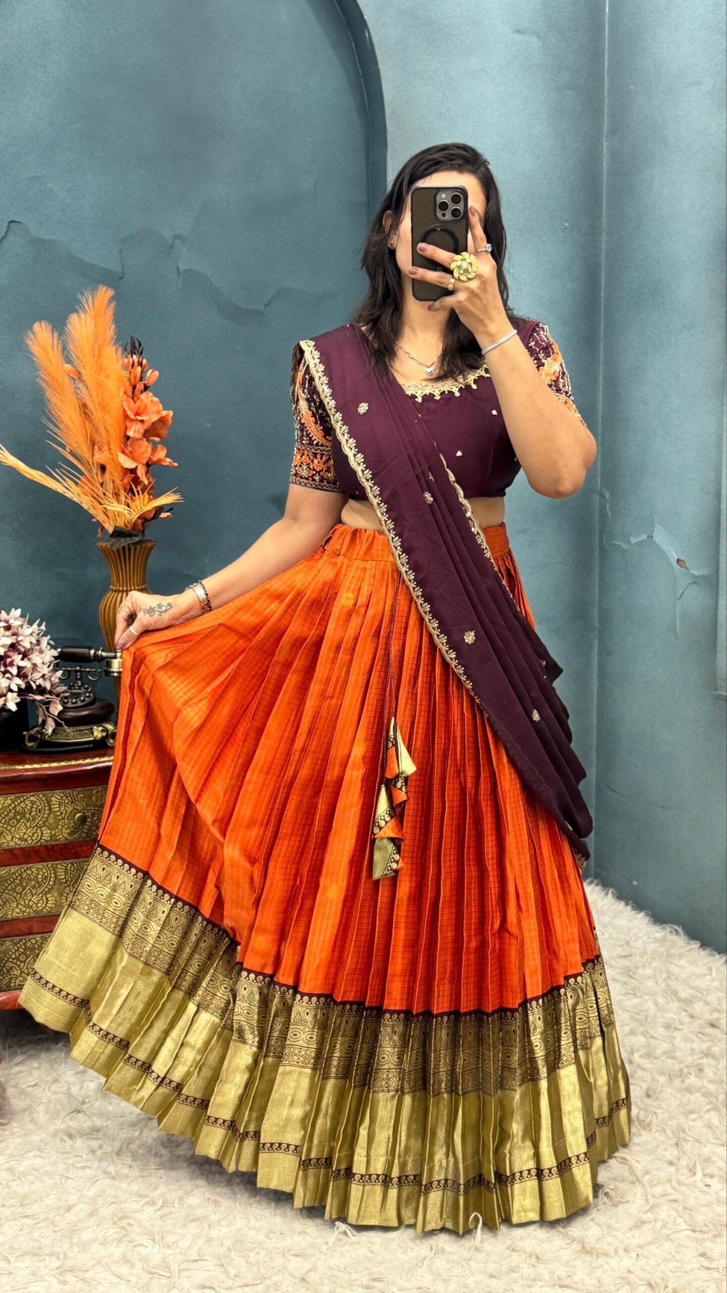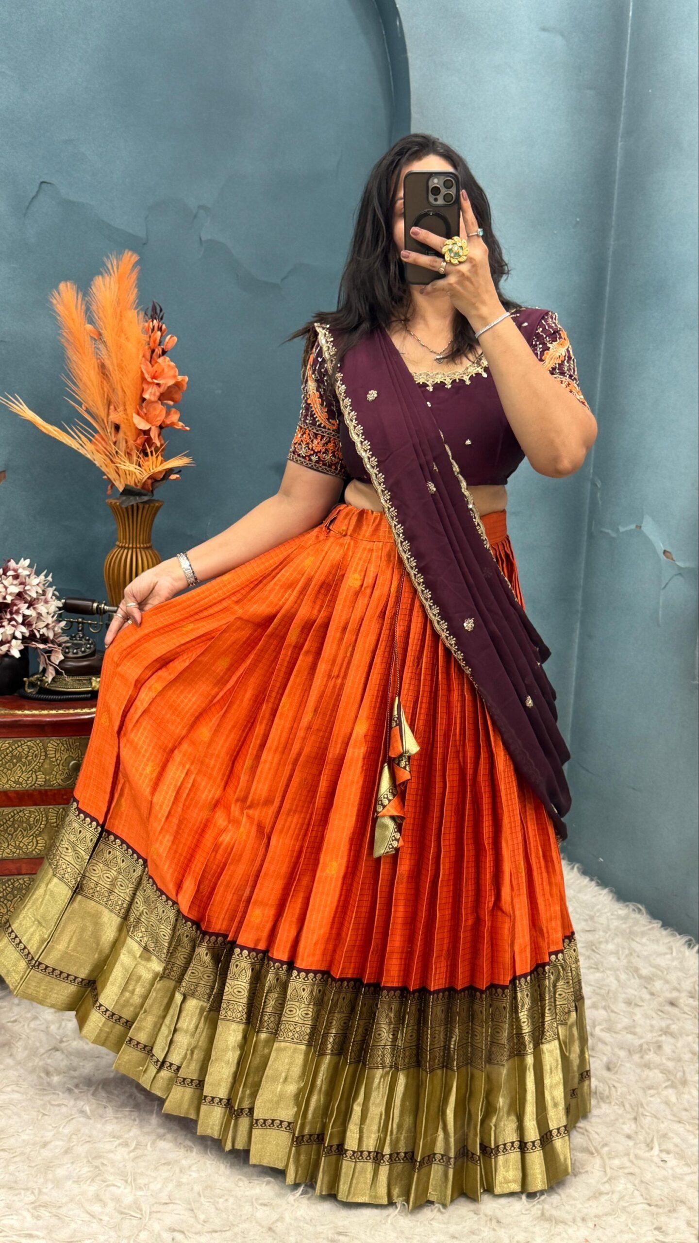 *Lehanga Details*:- Full stiched Kanjivaram silk With big jequard Border attached with Canvas patta zip and Latkan