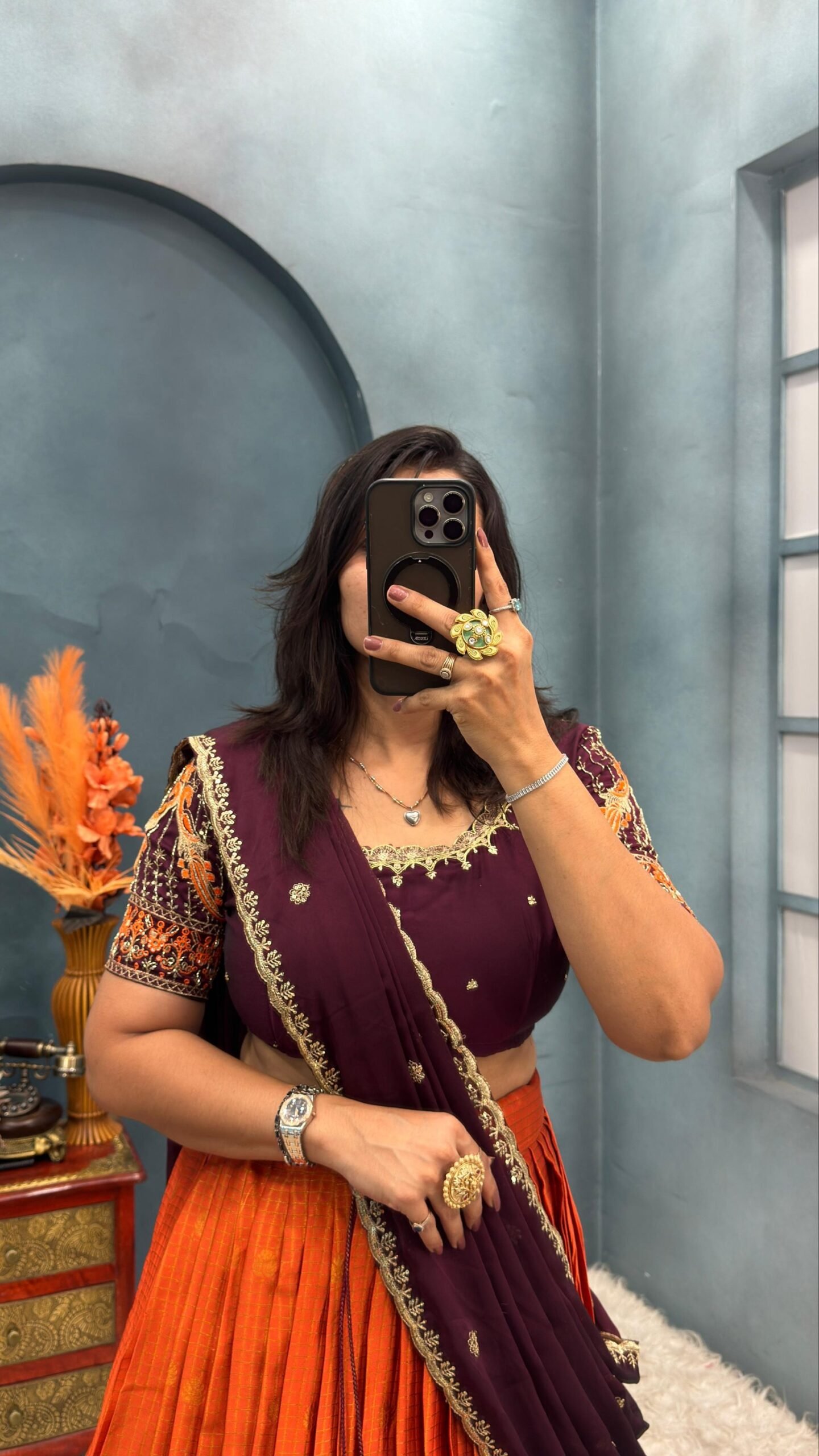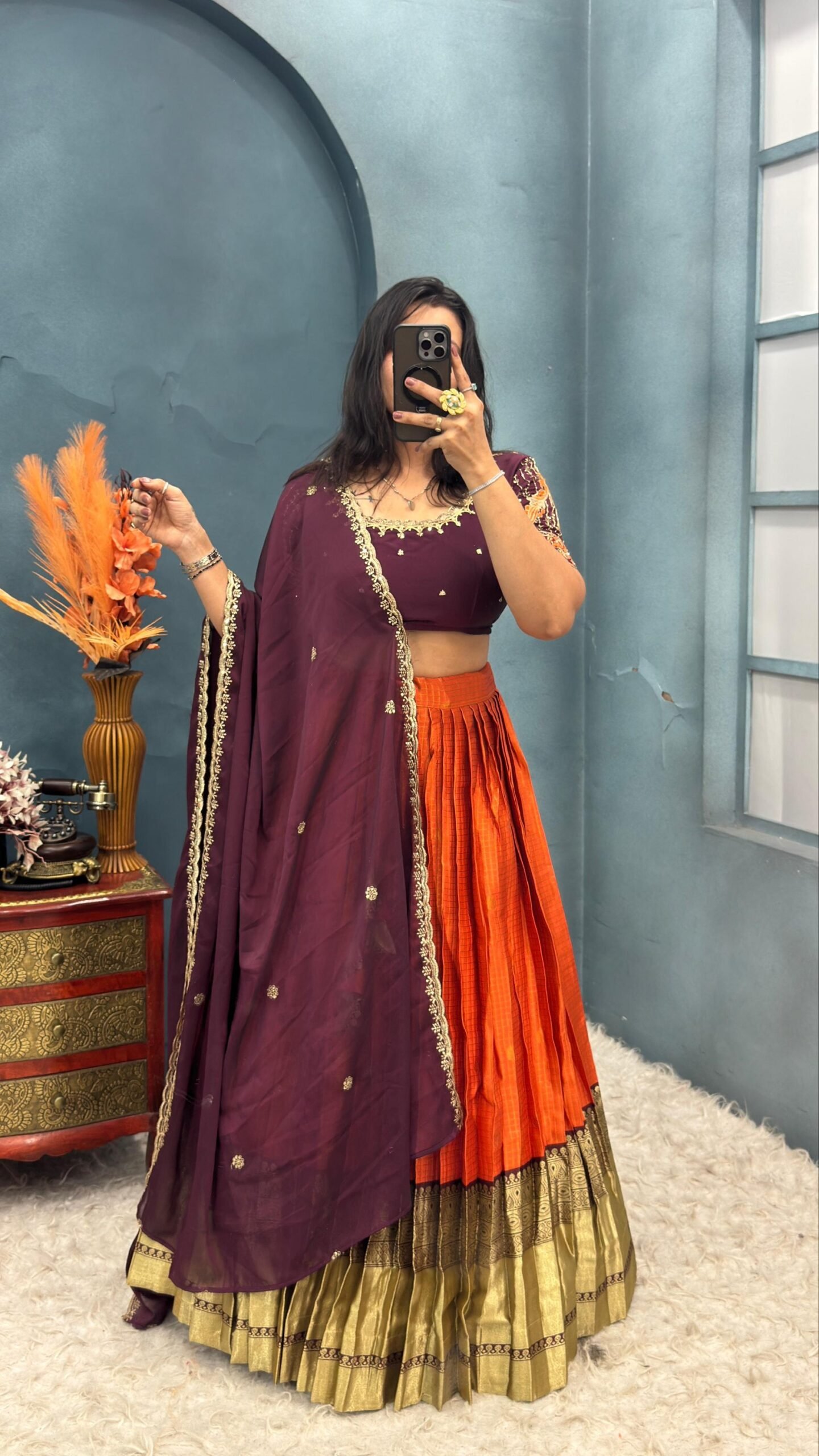 *Launch New Exclusive Designer Premium Quality Pure Kanjivaram silk full stiched Lehenga With Full stiched Designer Maggam work blouse With embroidered work dupatta which gives u totally Decent and Extraordinary look For this Festival Marriage Season*