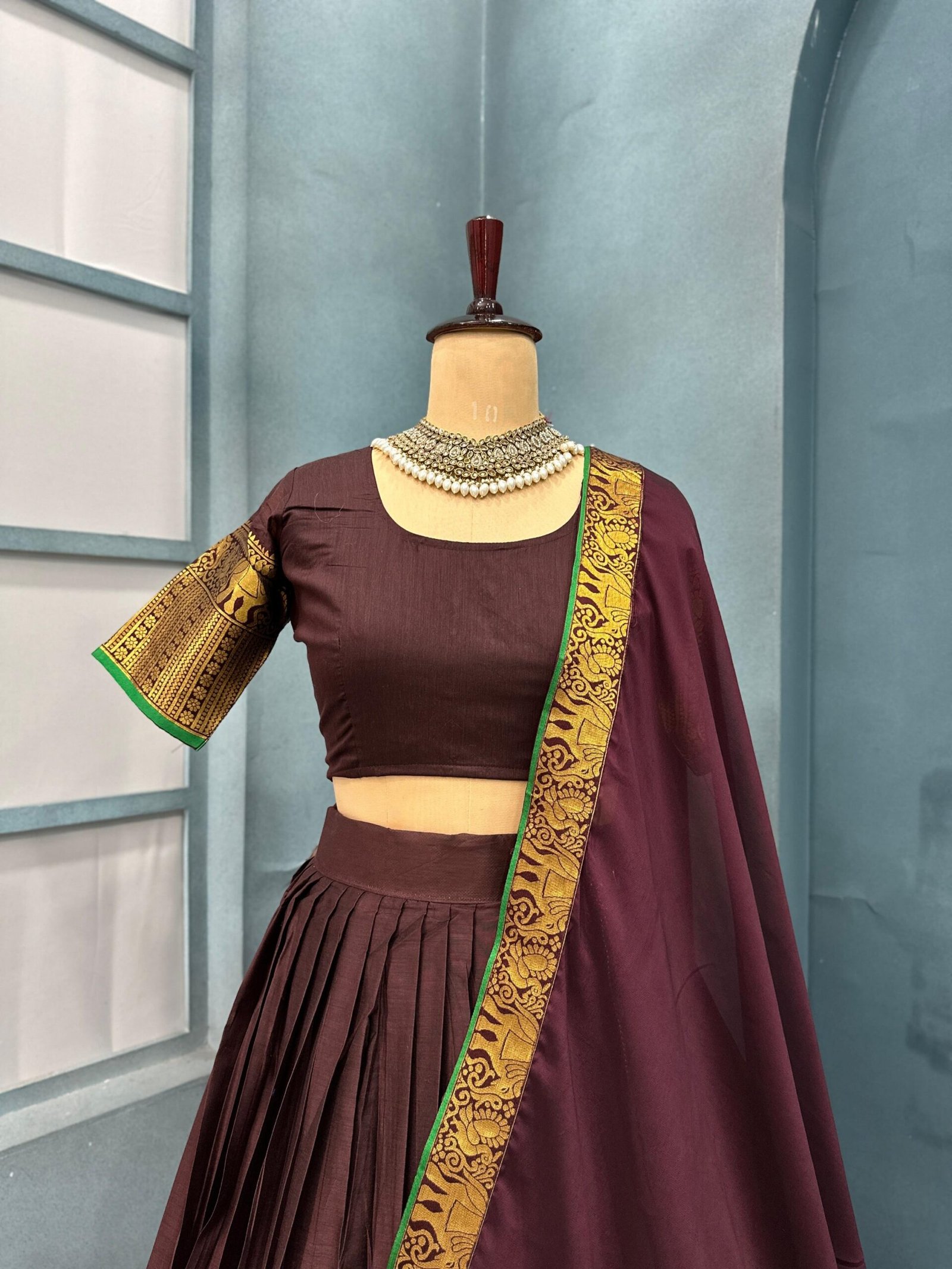 Launch New Exclusive SUMMER SPECIAL exquisite most trending PURE COTTON silk with real zari jacquard border Lehenga Half saree set showcases a harmonious blend of vibrant colors and luxurious fabric. This Dhawani set features a stunning border that elegantly frames the flowing silhouette, enhancing its overall appeal. Perfect for festive occasions or weddings, this attire combines traditional craftsmanship with contemporary style, making it a must-have addition to any wardrobe. The soft silk material ensures comfort while exuding sophistication, allowing the wearer to make a striking impression.