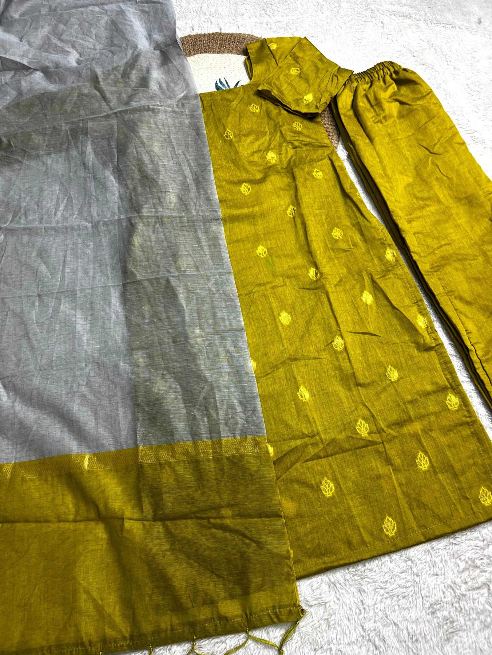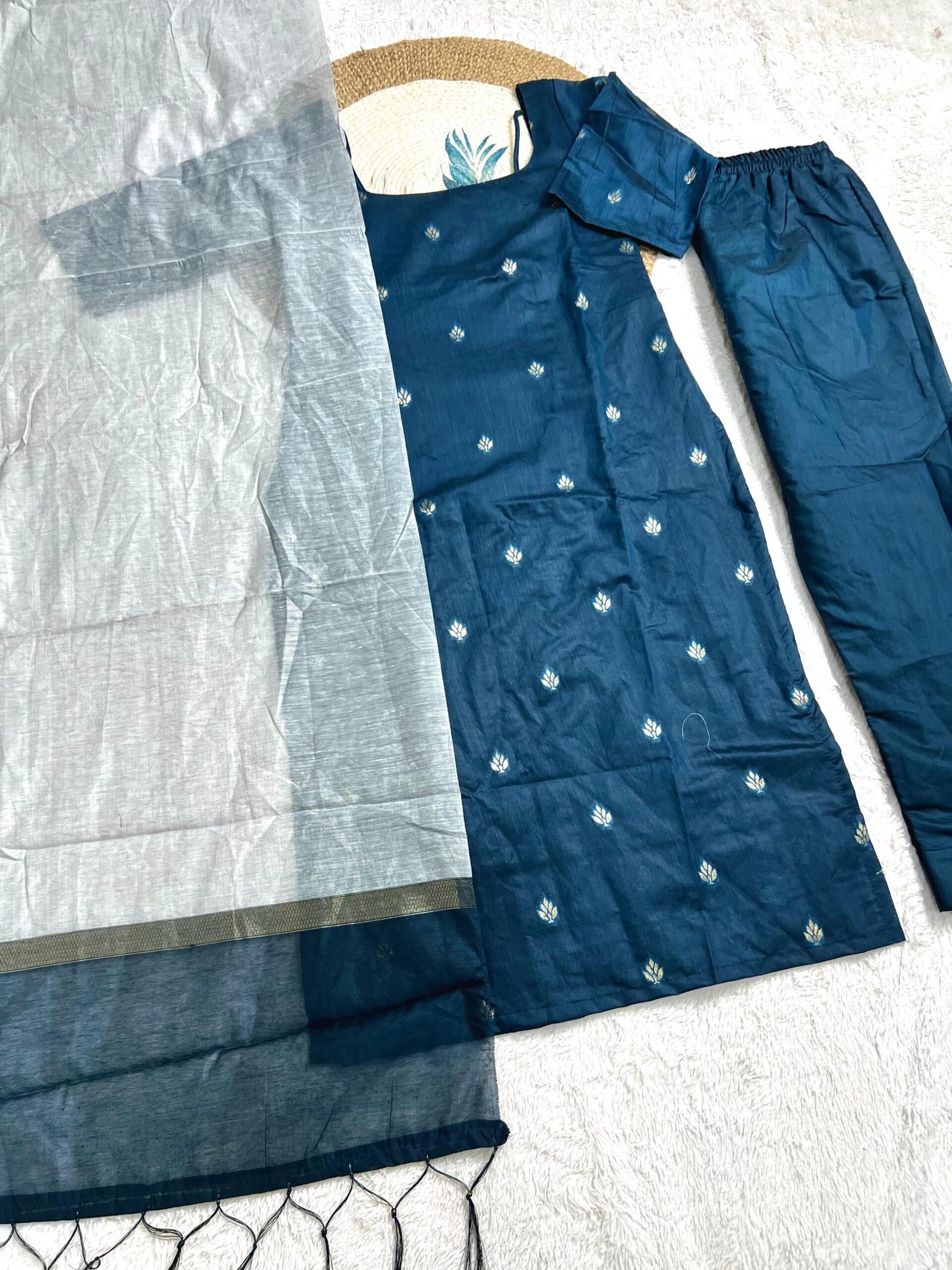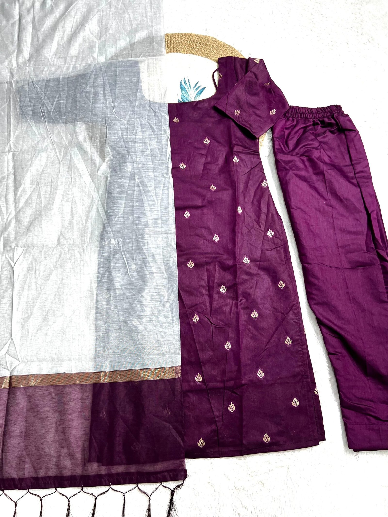 Elevate your style with this stunning pure silk cotton Kurti set with beautiful zari butta work and beautiful contrast zari weaving dupatta and same silk cotton pant ..This is perfect upcoming deewali and festival wear