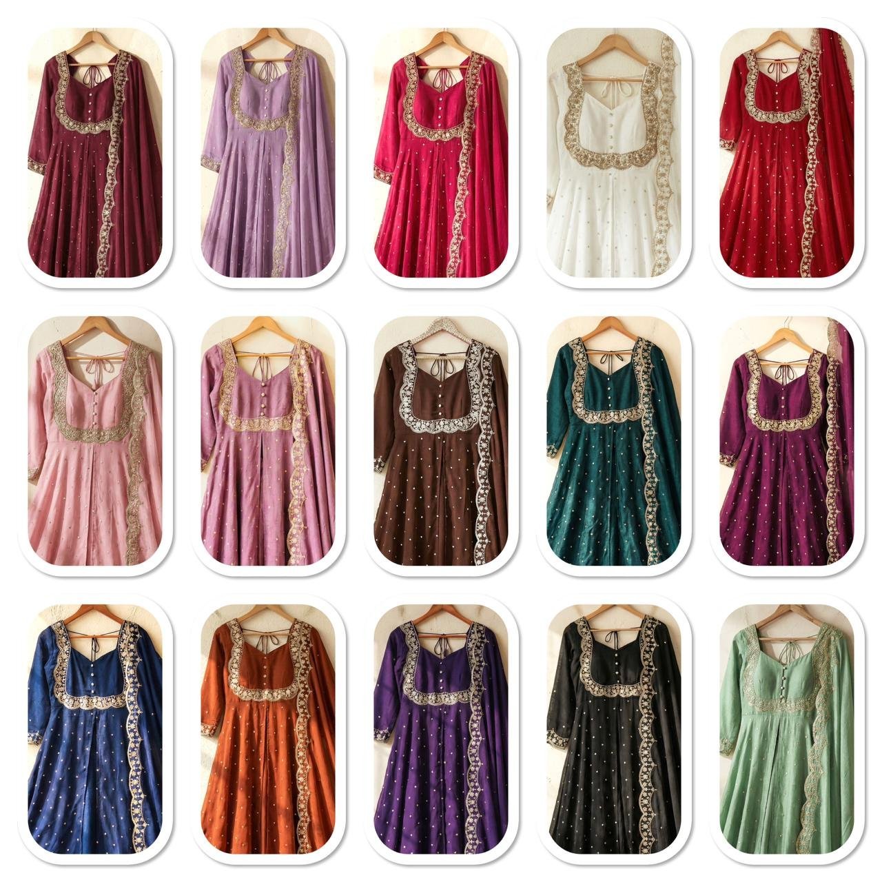 Baby pink, Black, Blue, Dark Green, Lavender, Majenta, Onion pink, Orange, Pink, Pista Green, Purple, Red, Rust, Skin, Wine